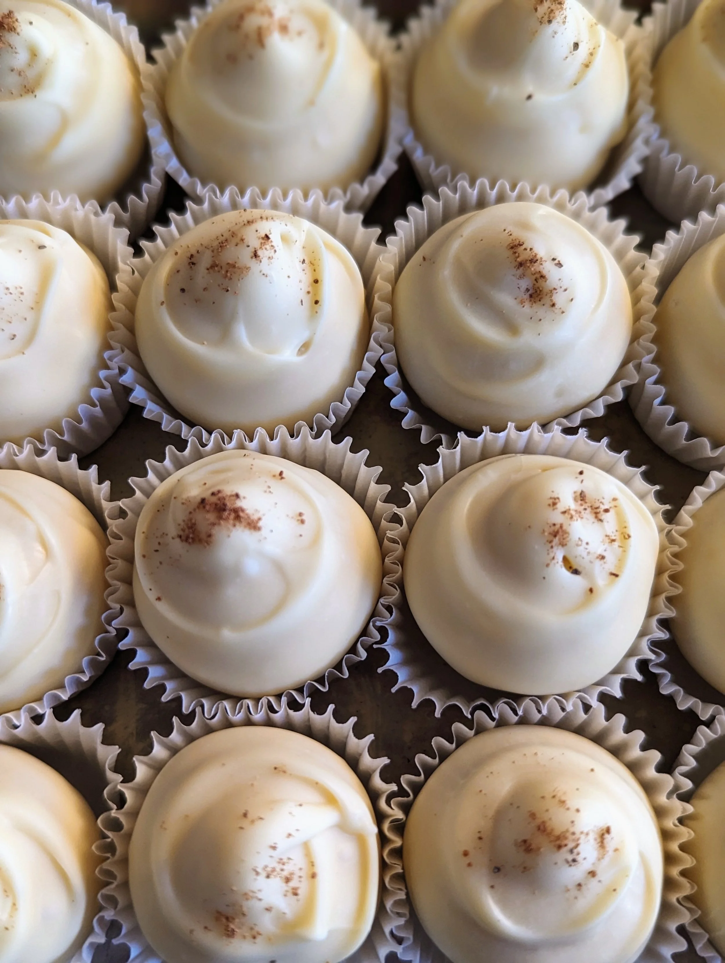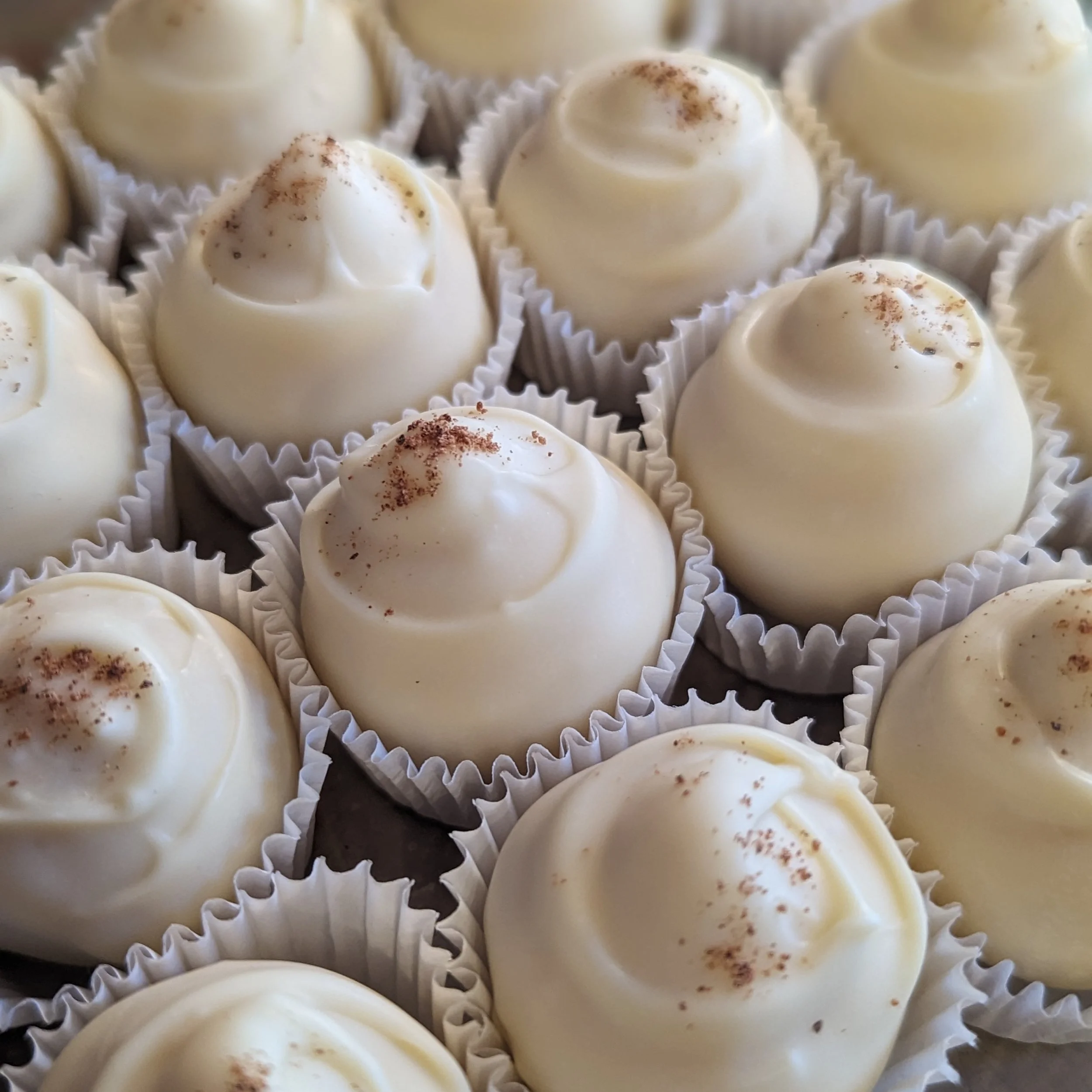 These sweet holiday treats are made with a hand rolled Guittard white chocolate ganache, combined with eggnog, nutmeg, and a rich, dark rum. These are dipped in white chocolate and topped with a sprinkle of nutmeg