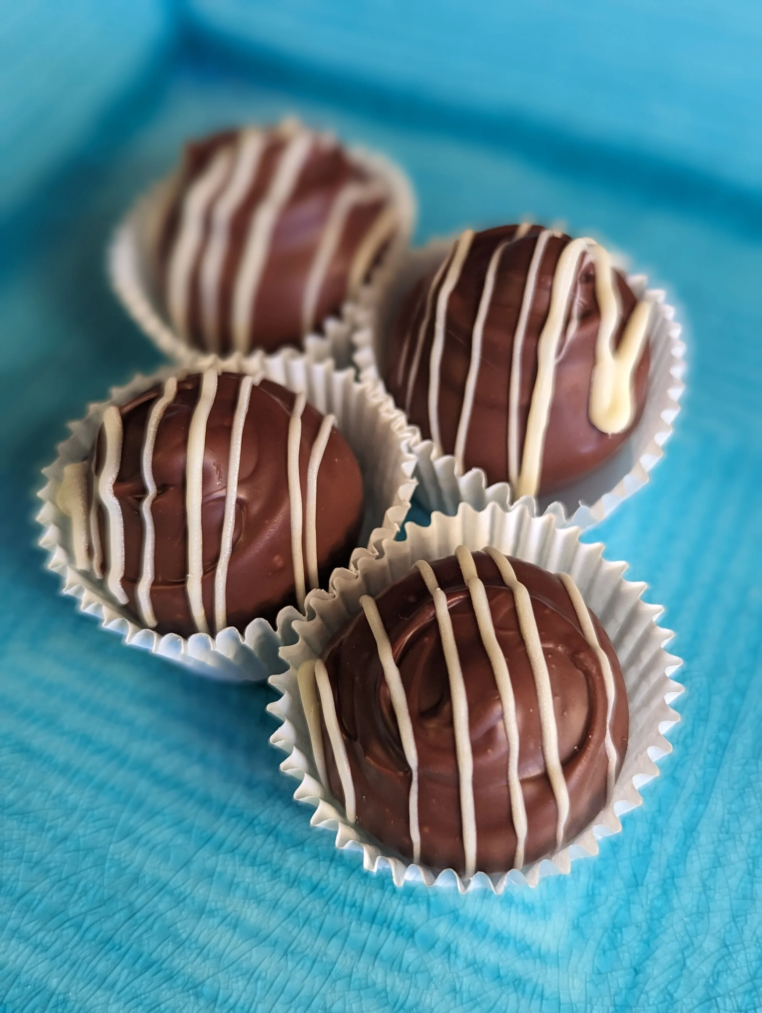 A collection of limited addition, hand rolled truffles. White chocolate Eggnog, made with dark rum and nutmeg, milk chocolate Gingerbread, made with gingerbread spices, dark molasses, and a white chocolate drizzle, dark chocolate Peppermint Hot Chocolate, made with organic hot cocoa mix, peppermint essential oil, and topped with crushed peppermint candy, and the Drunken Pumpkin, made with dehydrated pumpkin powder, pumpkin spice essential oils, and bourbon. This holiday collection will only be available till January 1st!