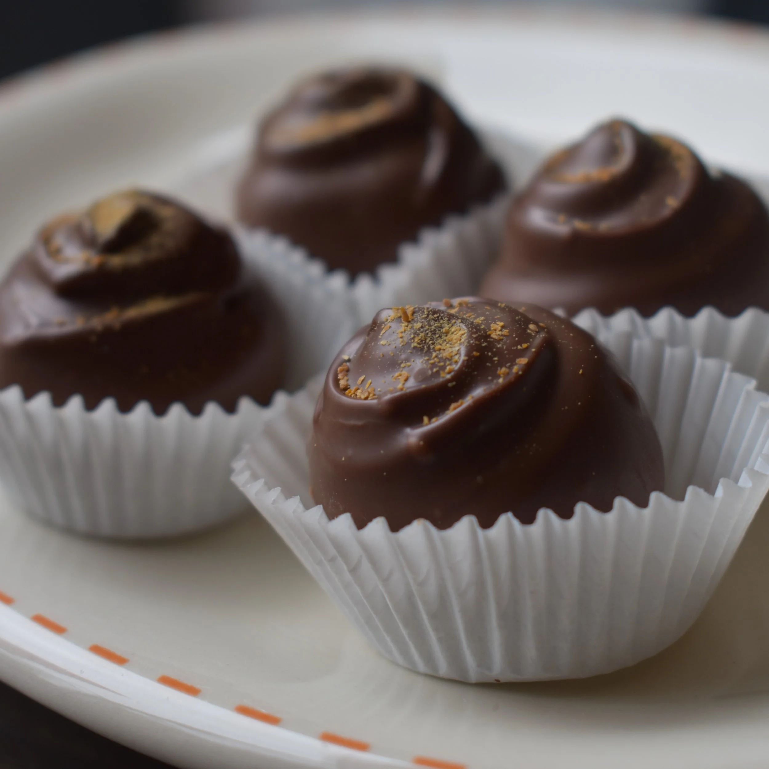 Green Tea is made with an organic matcha Guittard fair trade certified dark chocolate ganache. The center is hand rolled in organic match powder, dipped in dark chocolate, and garnished with a sprinkling of organic matcha powder.