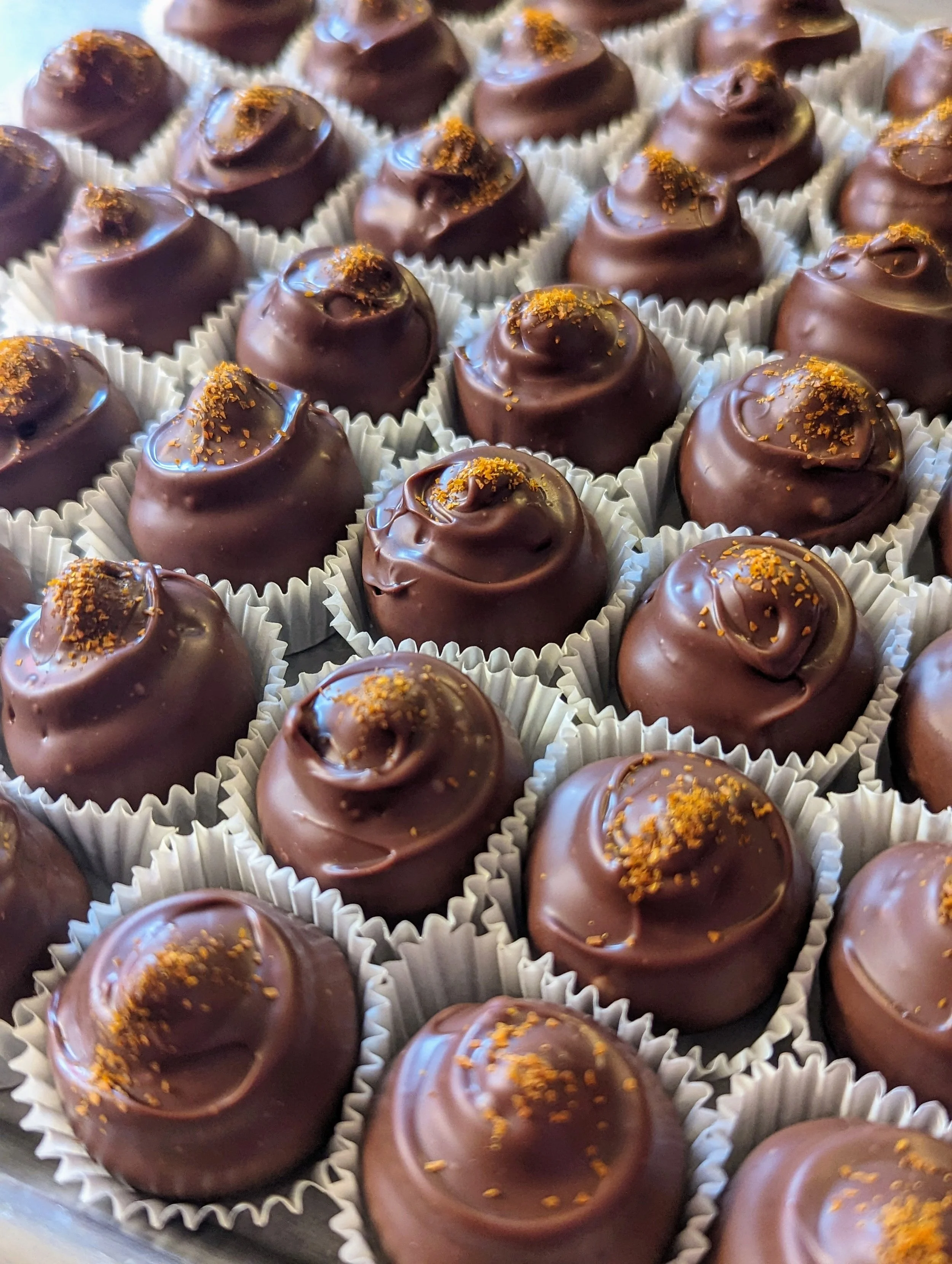 And the new addition--the Spiked Blood Orange Black Tea--is made with loose leaf English Breakfast Tea, fresh squeezed blood orange juice, and Colorado local Deviation Blood Orange Gin in Callebaut fair trade certified ruby chocolate. The center is hand rolled in organic cocoa powder, dipped in ruby chocolate, and garnished with candied blood orange peel.